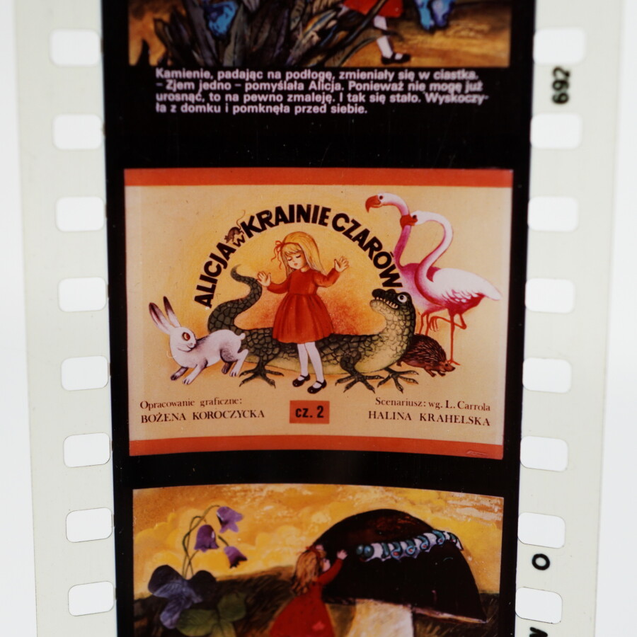 Nasz rzutnik i kolekcja bajek był jednym z tych skarbów, które przez blisko 30 lat starannie przechowywaliśmy z zamiarem pokazania kolejnemu pokoleniu. Poza rzutnikiem zachowała się dosyć spora kolekcja diapozytów (kurcze – podoba mi się to słowo 🙂 ). W naszej kolekcji znajdują się m.in. takie bajeczki jak: „Śpiąca Królewna”, „Kopciuszek”, „O Smoku Wawelskim”, „Mała Syrenka”, „Farbowany lis”, „Kłopoty babuleńki”, „Królewicz i żebrak”, „Zabłąkany kotek”, „Baśń o rumaku zaklętym”, „Flip i Flap”, „Alicja w Krainie Czarów”, „Kaczka Dziwaczka”. Łącznie mamy ich prawie 50.