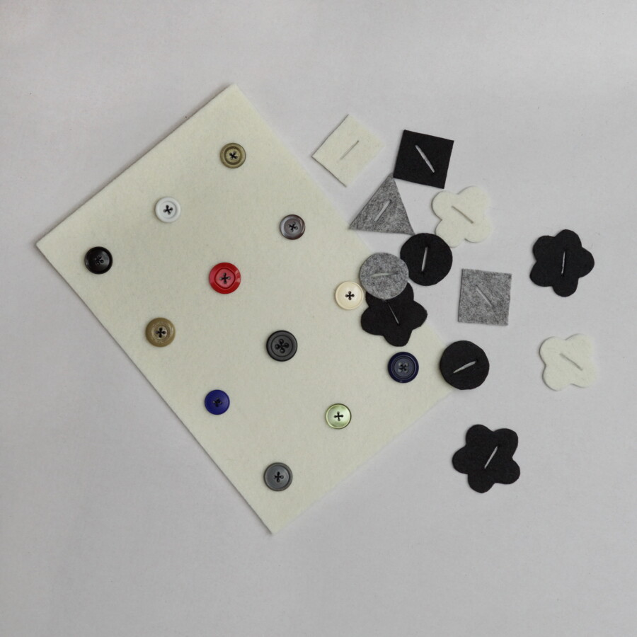 Przygotuj kilka arkuszy grubego filcu, guziki, igłę i nitkę. Najlepiej jeśli filc jest różnokolorowy. Wytnij z filcu kształty: kwiatki, koła, serduszka – co wolisz. Natnij je przez środek, by powstał w nich otwór, przez który dziecko zapnie guzik. Guziki przyszyj do arkusza filcu. Jeśli nie posiadasz filcu, możesz użyć grubszej tkaniny lub jeansu, jednak jeśli nie obszyje się krawędzi, to szybciej zużyją się łatki i sam podkład, które będą się strzępić. Filc sprawdza się idealnie.